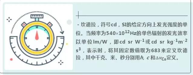 -坎德拉,符號cd,SI的給定方向上發(fā)光強(qiáng)度的單位。當(dāng)頻率為540′1012Hz的單色輻射的發(fā)光效率以單位lm/W,即cd sr W-1或cd sr kg-1m-2 s3,表示時,將其固定數(shù)值取為683來定義坎德拉,其中千克、米、秒分別用h, c 和DnCs定義。